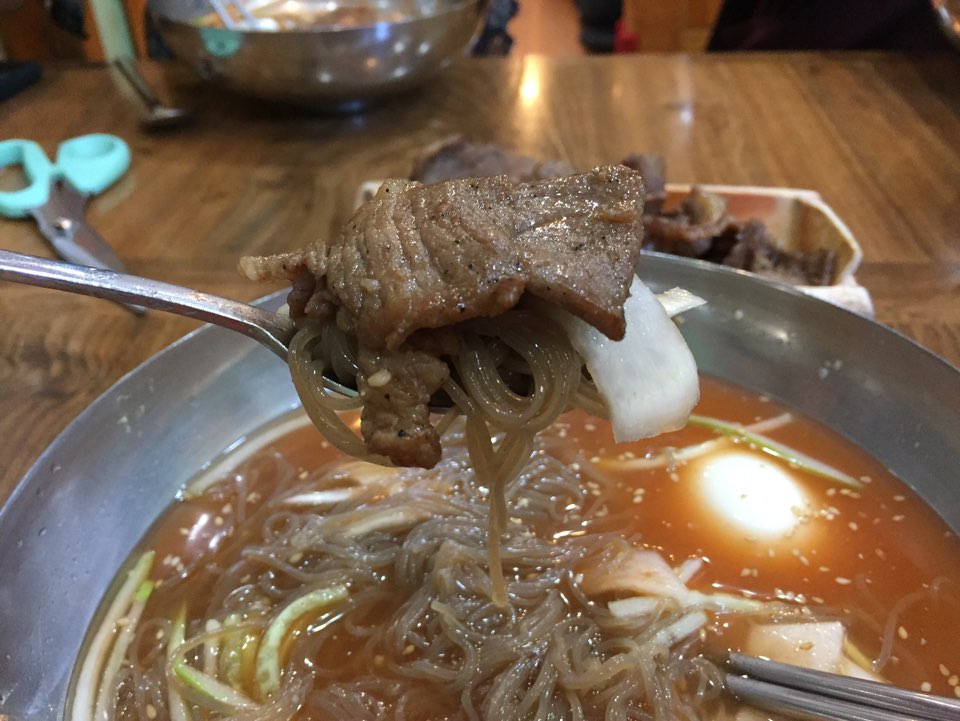 시원한 냉면과 고기의 짭쪼롬한 양념이 어우러져서 살짝 밍밍한 냉면이 입 안에서 조화를 이룹니다.